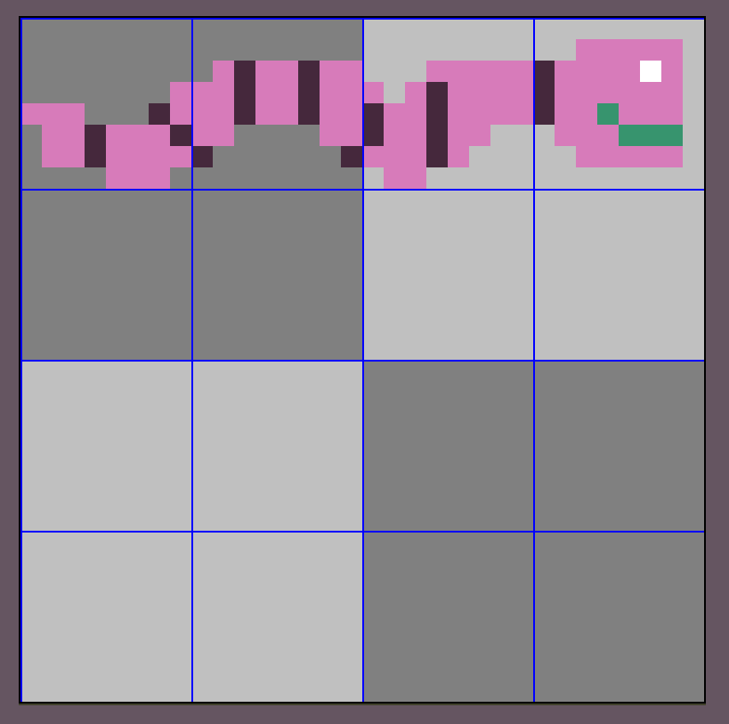 int main() { ... u16 *startingTile = (u16 *)(&tile_mem[4][0]); u32 x = 29; u32 y = 2; u32 paletteIndex = 4; setPixel(startingTile, x , y , colorIndex ); ...}The function is given startingTile, which is the very first tile of the sprite, just like before. We need to jump ahead to the tile that contains the x and y coordinate we are interested in. If we divide those coordinates by 8, we will get x and y tile indexes. In our example we passed in x=29 and y=2, which maps to tile indexes x=3 and y=0. Which makes sense, if you look above at the worm sprite, its eye is in tile 3 (the first tile is tile zero).