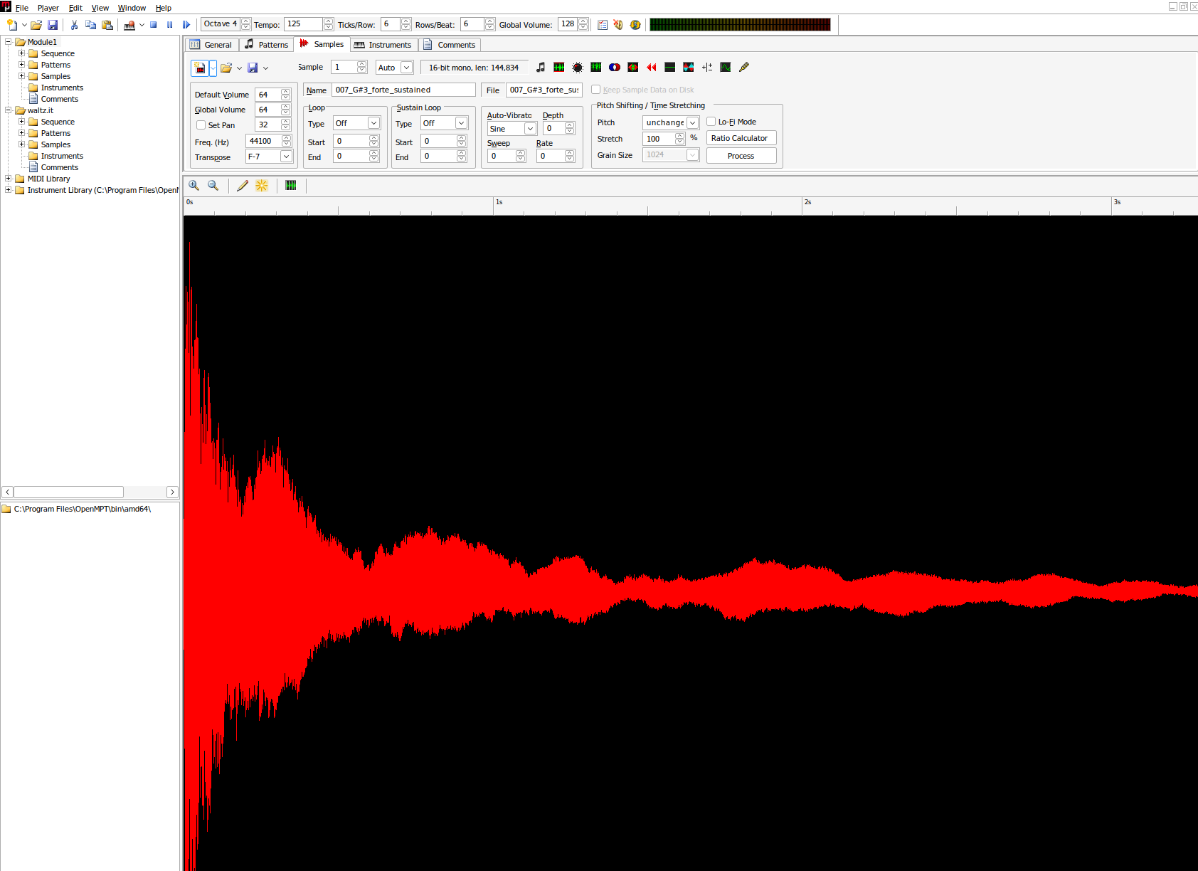 You can play the sample here by clicking the "Play Sample" button, which has a music note on it. You can also do many things to the sample here such as trim it, convert it from stereo to mono, and much more. OpenMPT is a very thorough, and very complex program. Could we have just patched the sample up here instead of using Audacity? Probably, but I'm a total newb to OpenMPT so one step at a time.