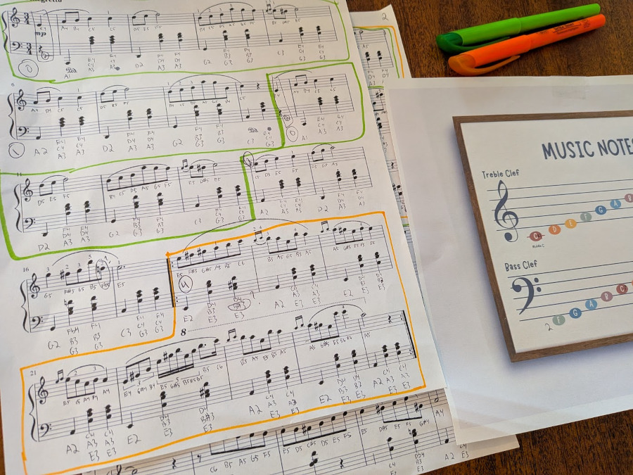 Like I said, I'm not a musician; I've not played an instrument since I was a little kid. I can juuuuuuuust barely read music, thankfully my wife was able to help me here. I printed out the sheet music for the Waltz, and a cheatsheet, then proceeded to write down all of the notes of the song.